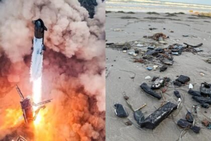 La marea en Playa Bagdad dejó expuestos nuevos fragmentos de la nave Starship 36 de la compañía SpaceX; organizaciones ambientales alertan sobre su impacto en la fauna local. Matamoros, Tamaulipas. – ...